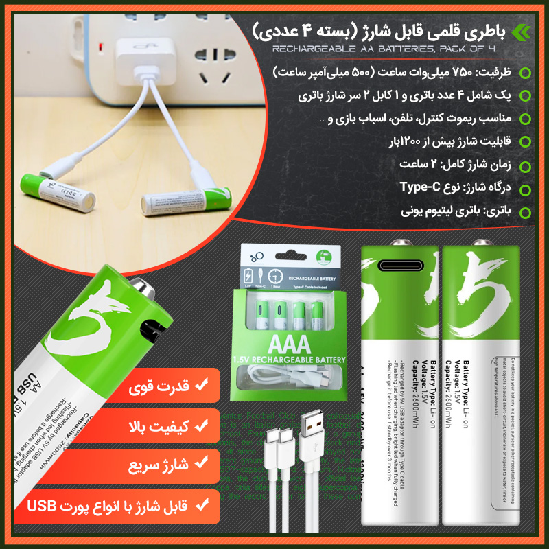 – پک شامل 4 عدد باتری و 1 کابل 2 سر شارژ باتری