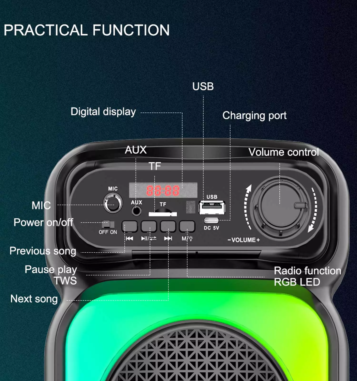اسپیکر بلوتوثی میکروفون از رادیو FM پیشتیبانی می کند که برای اتصال غیر از بلوتوث می توانید از میکرو Sd و فلش مموری USB و کابل AUX از آن برای پخش موسیقی یا صدای فیلم و ویدیو استفاده نمائید.