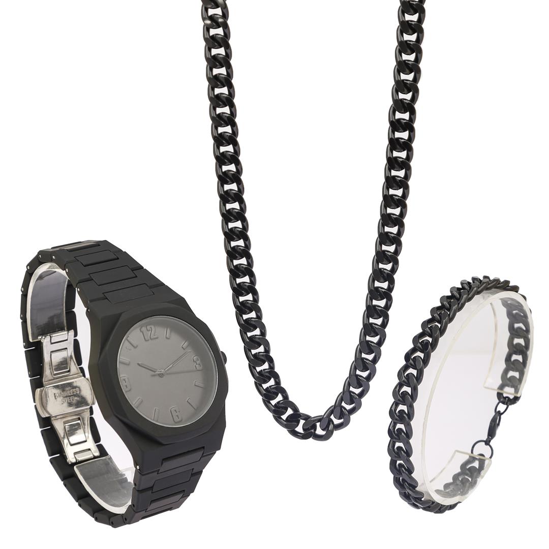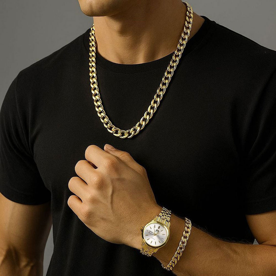 تنوع: این ست 3 تیکه ساعت دستبند و گردنبند استیل طلایی رنگ مردانه، مناسب تکمیل کردن انواع استایل روزمره مردانه است.