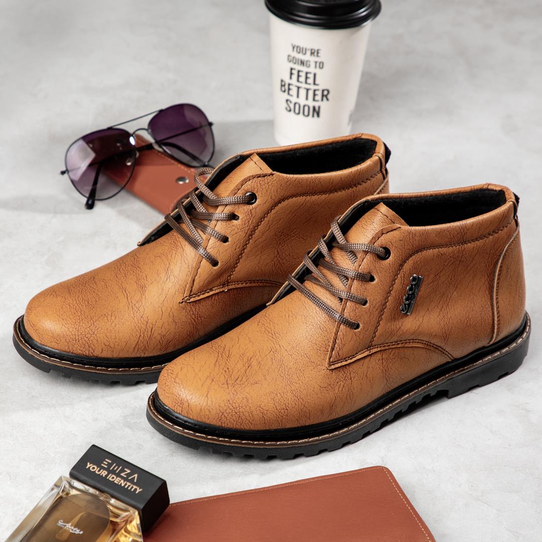 کفش نیم بوت چرم مردانه رنگ قهوه ای شتری کلاسیک