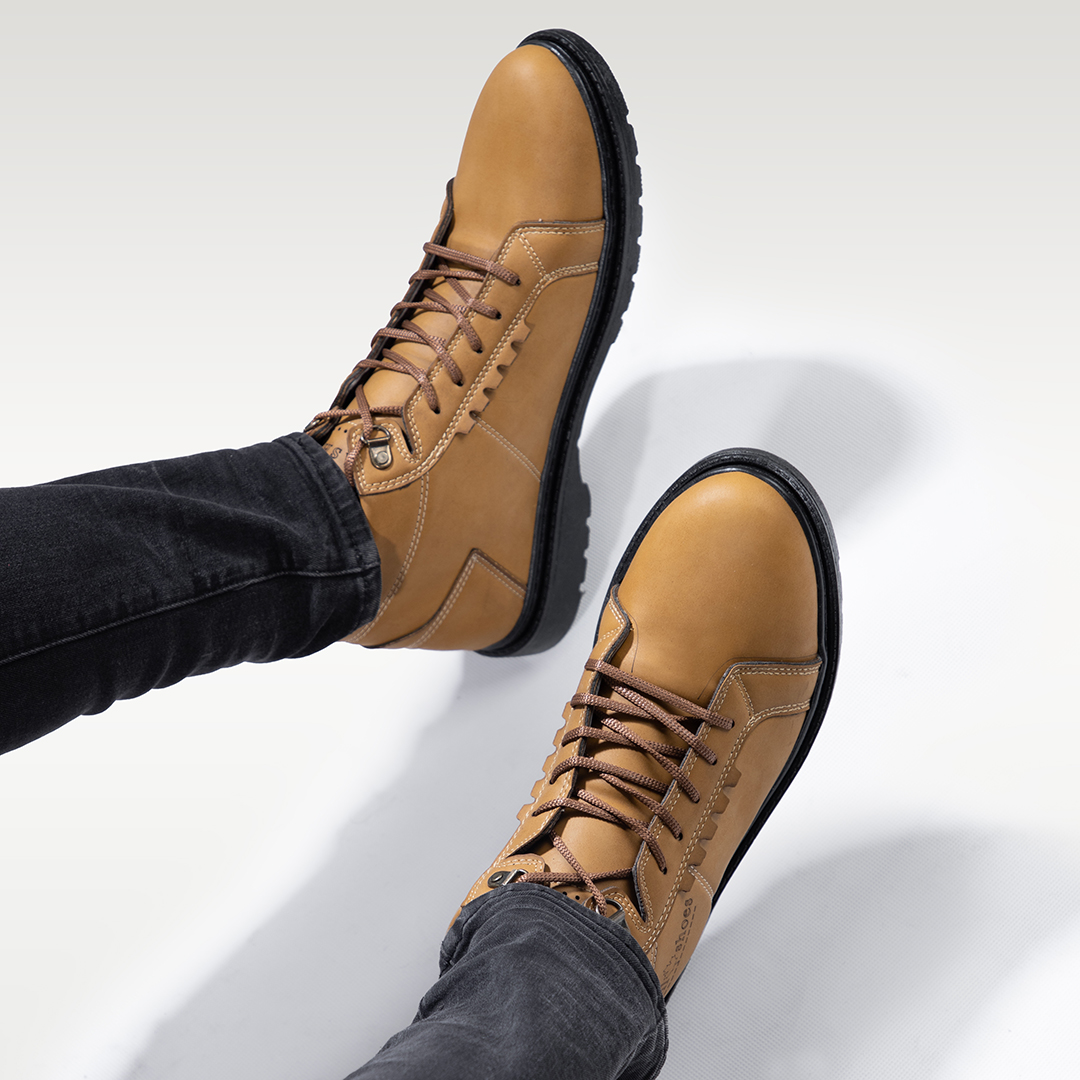 🛍 ظاهری امروزی و شیک را با این مدل کفش ساقدار چرم عسلی شکل دهید.
