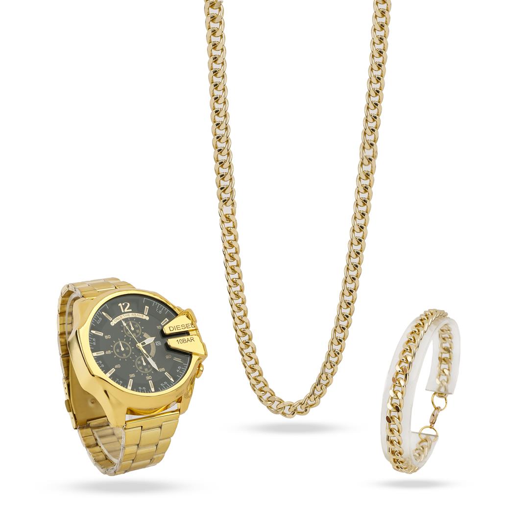 ست ساعت دیزل و دستبند گردنبند استیل طلایی کارتیر پسرانه Diesel_Cartier