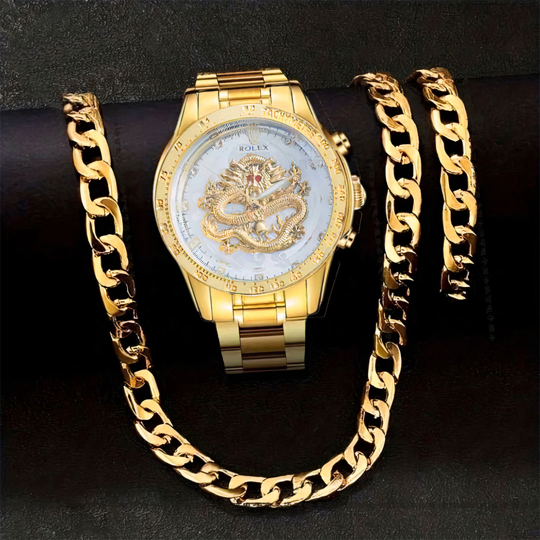 ست ساعت و نیم ست گردنبند و دستبند طلایی مردانه Golden_Dragon