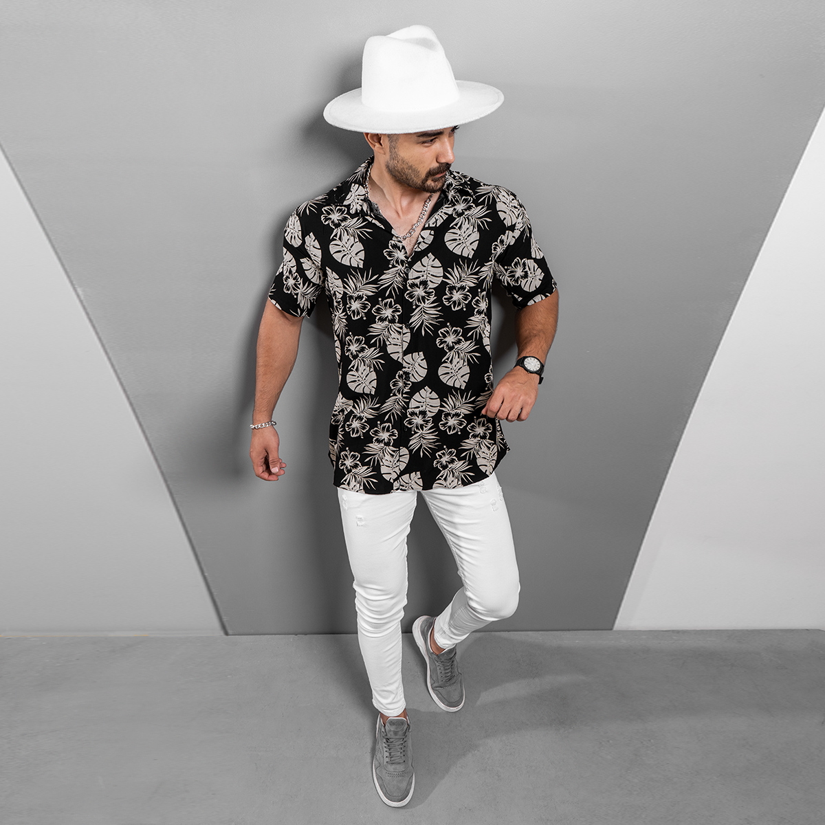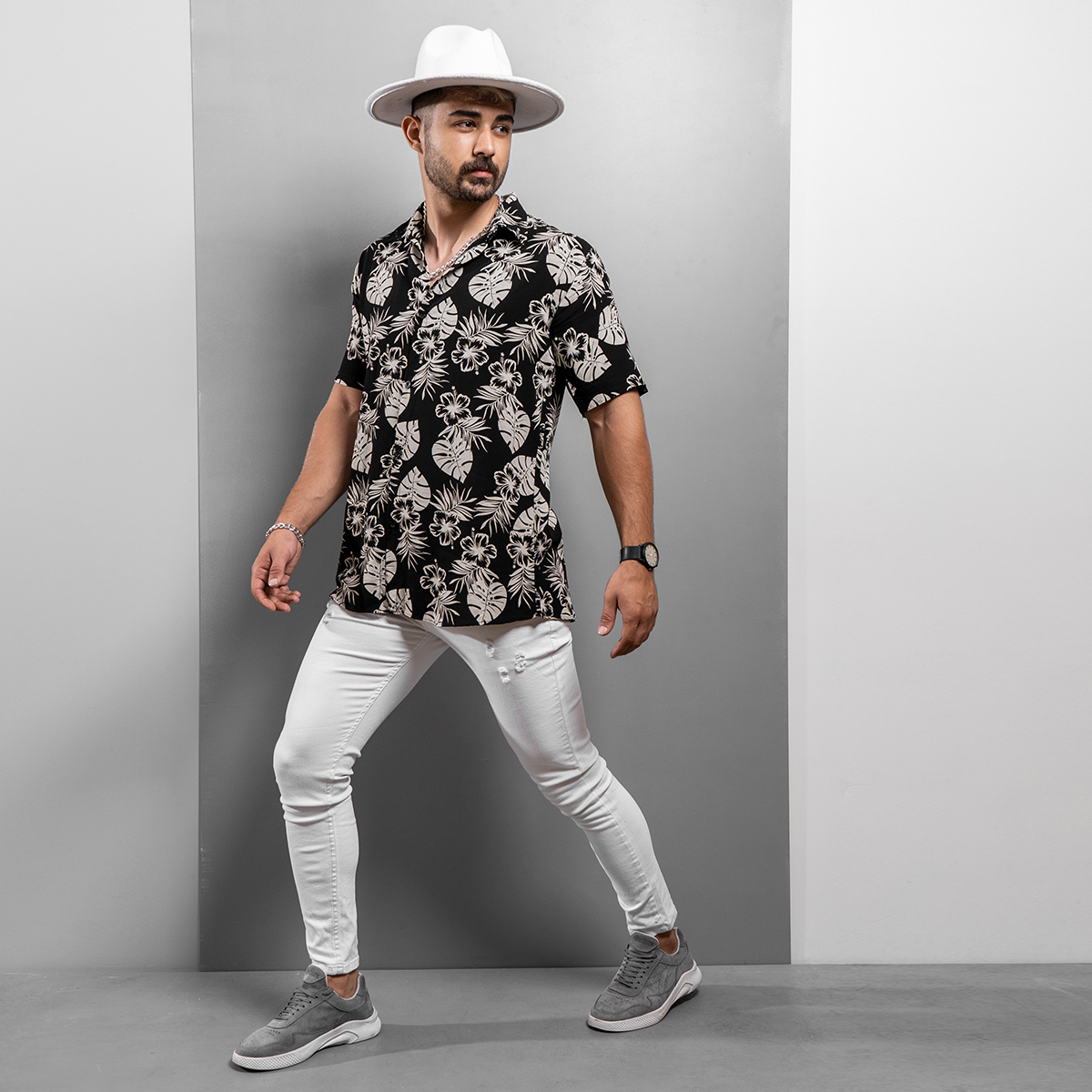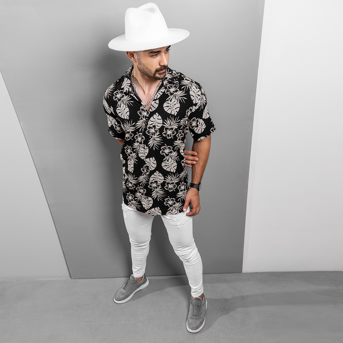 پیراهن هاوایی مردانه ( مشکی ) طرح گلبرگ 1400 جدید مدل Telin