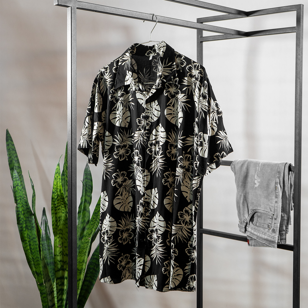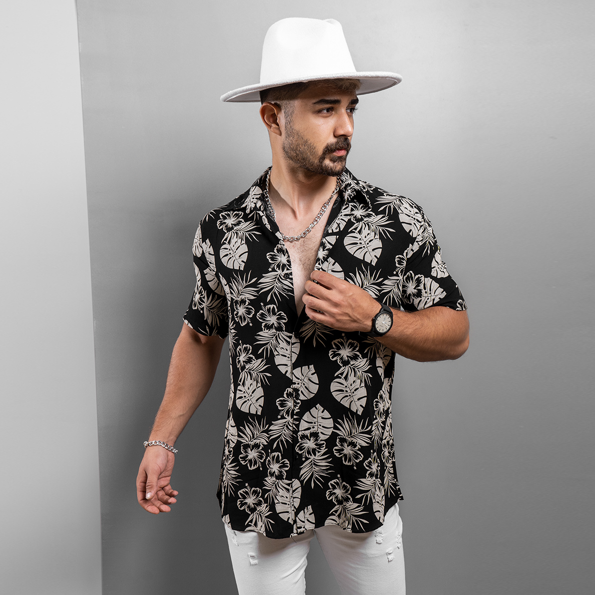 پیراهن هاوایی مردانه ( مشکی ) آستین کوتاه طرح گلبرگ