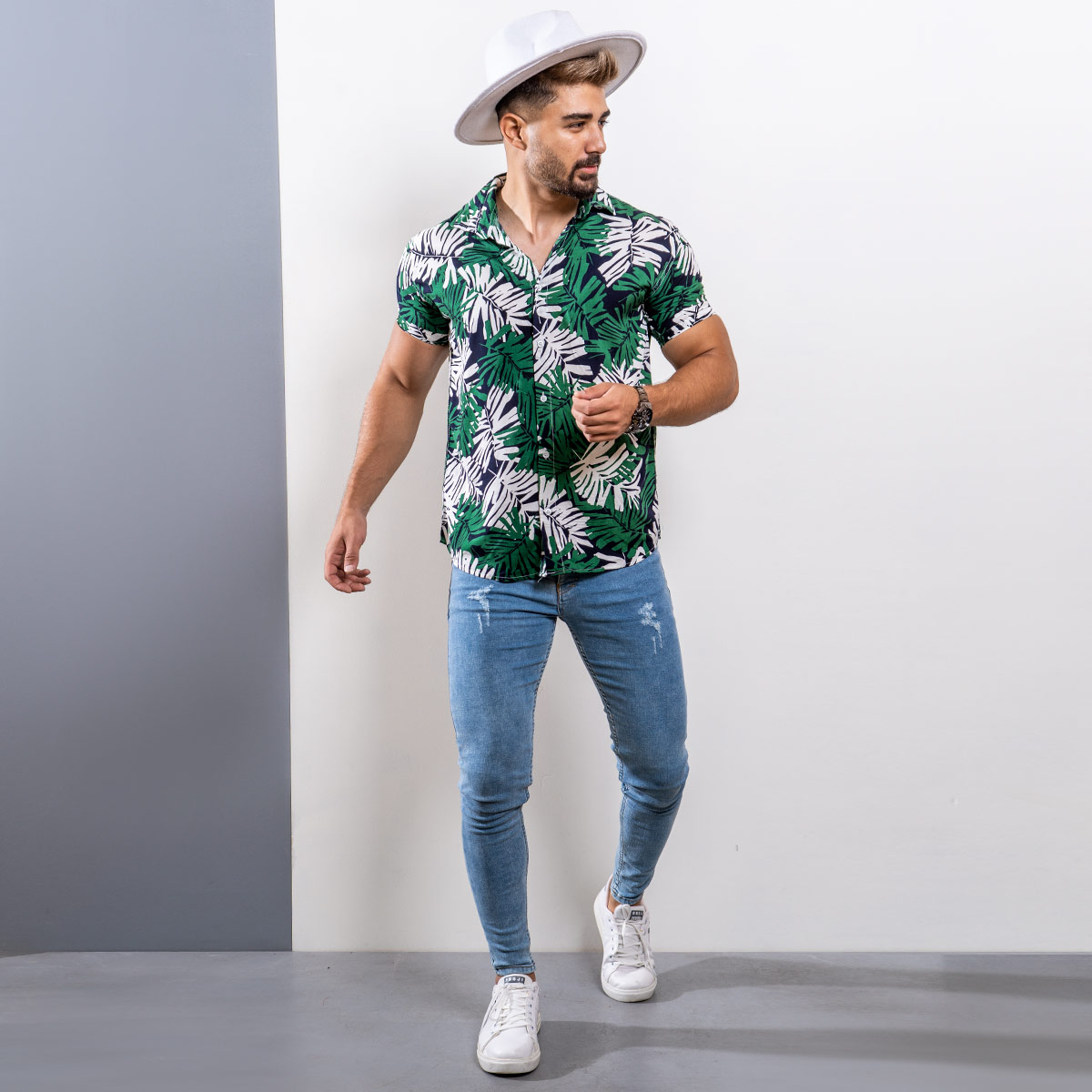 پیراهن هاوایی مردانه ( سبز ) آستین کوتاه طرح گلبرگ جدید