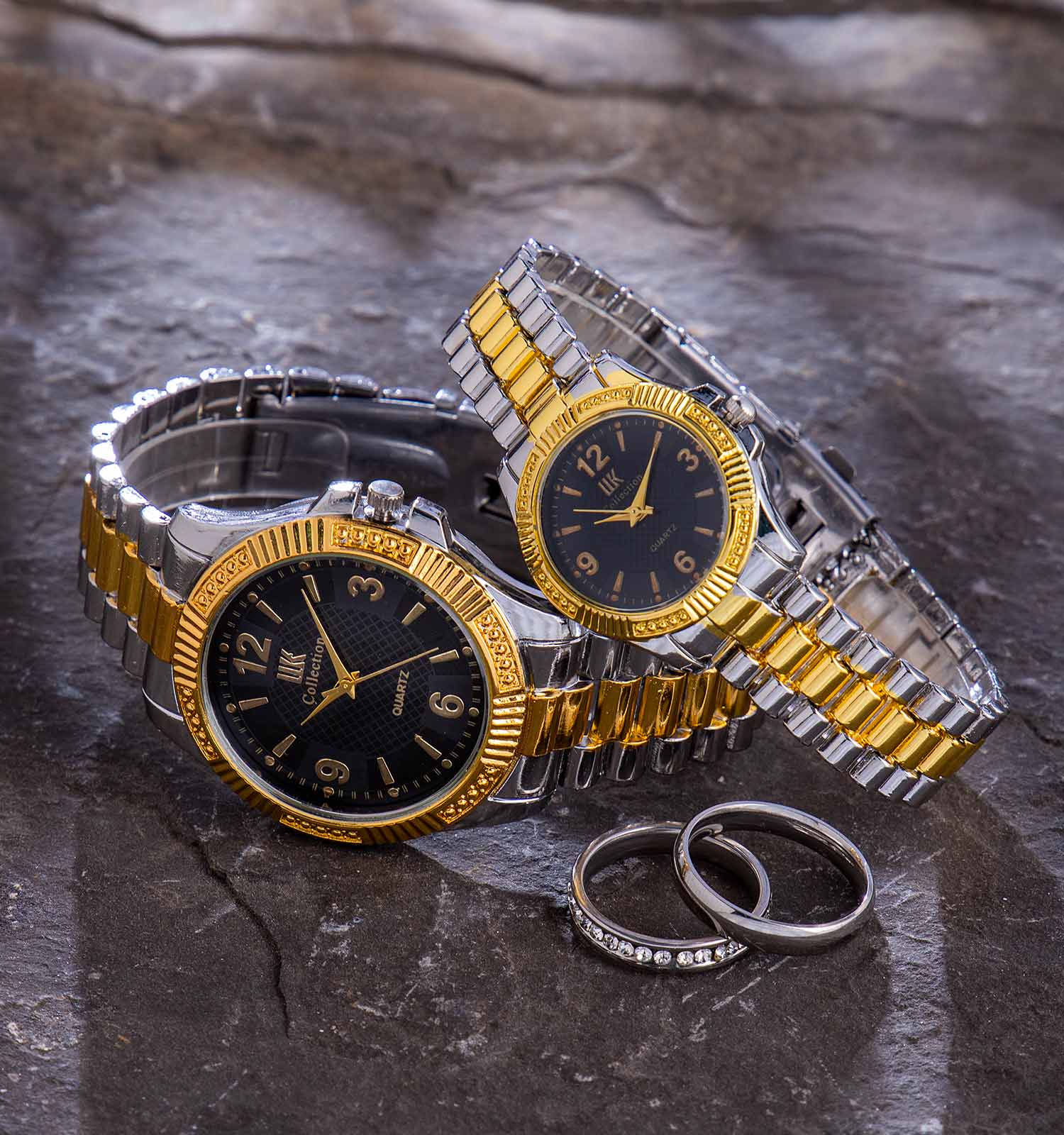 این مدل ست ساعت مچی مردانه و زنانه که از ترکیب رنگ طلایی و صفحه ی مشکی با طرح سه موتوره برخوردار است؛ از برند IIK Collection می باشد.