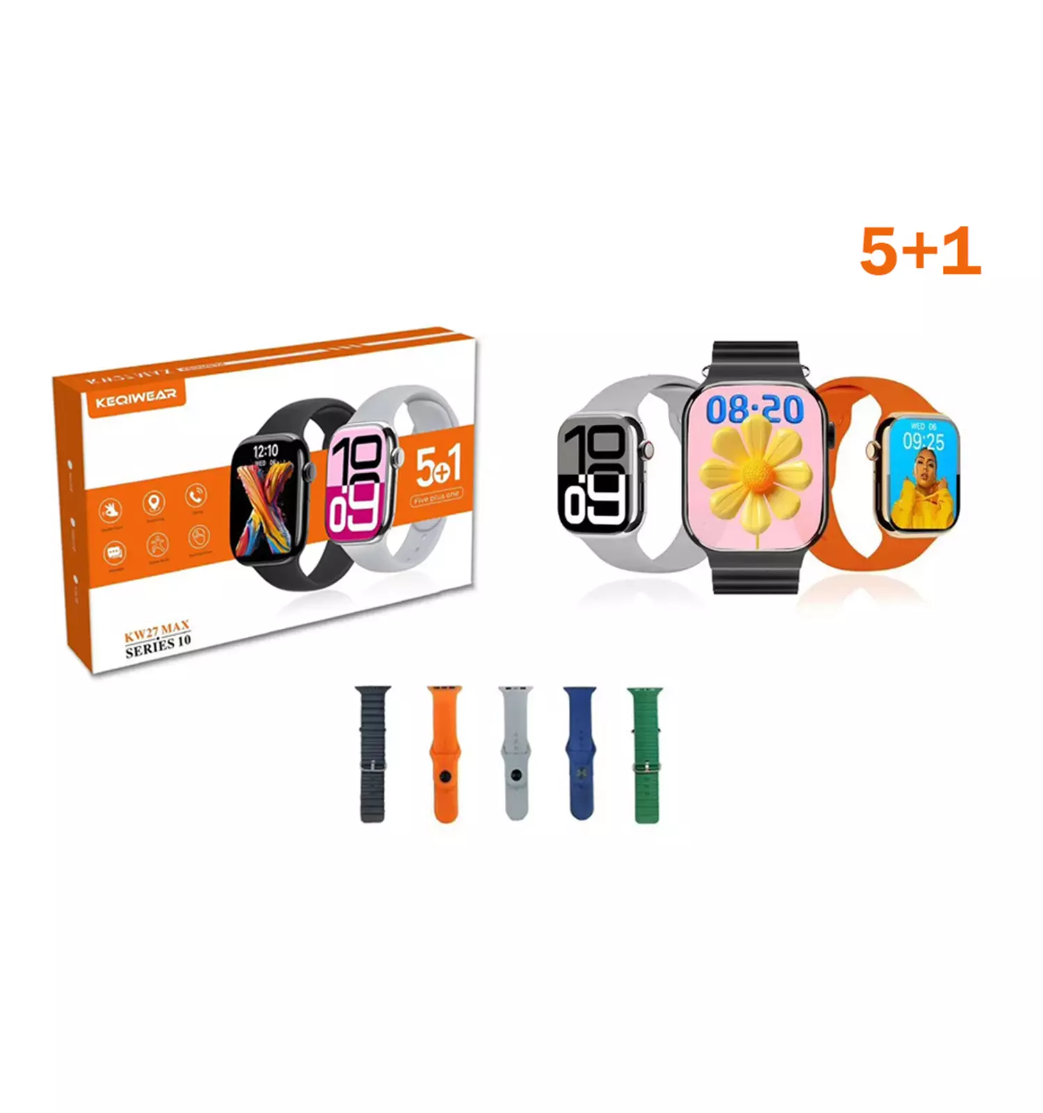 ساعت هوشمند دیجیتال kw27 Max 5 بند سیلیکونی دارای رنگ های مشکی و نقره ای سبز نارنجی نقره ای است.