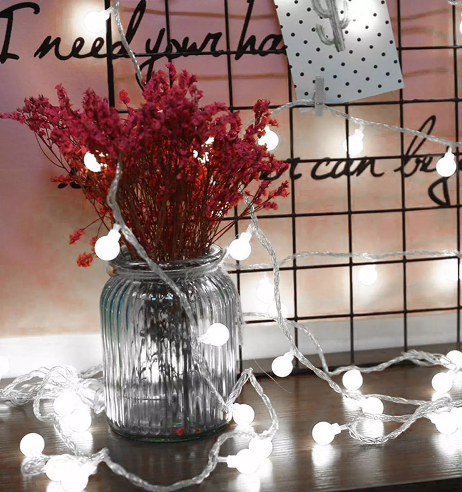 نورپردازی اتاق پذیرایی: از این ریسه توپی میتوان برای تزئین شومینه، قفسههای کتاب، گلدانها و سایر وسایل پذیرایی استفاده کرد.