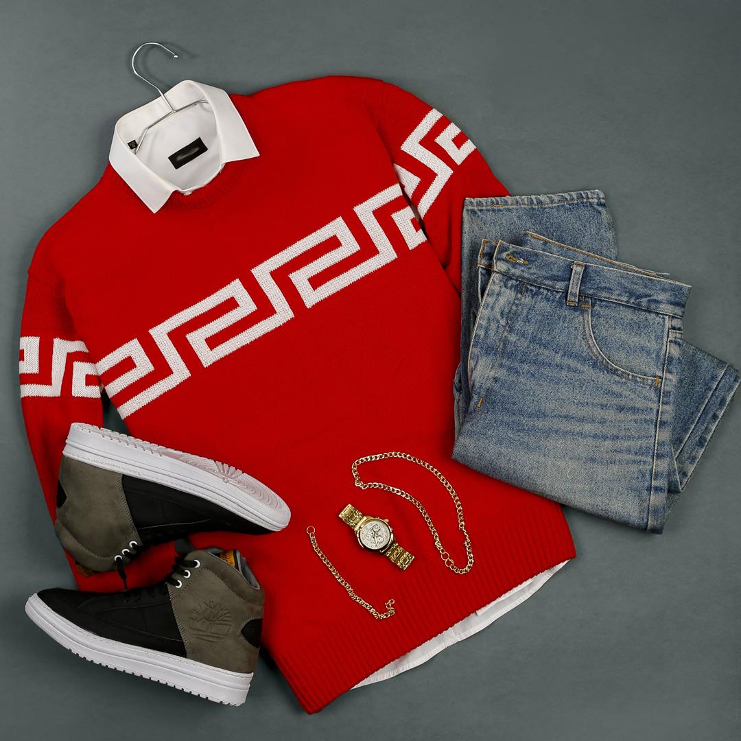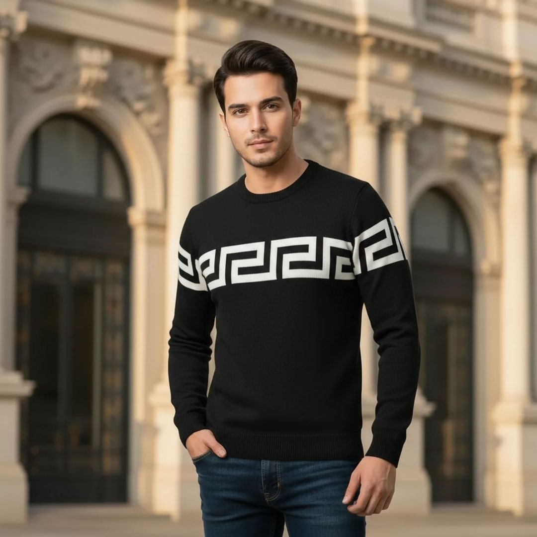 پلیور بافت مردانه مشکی و قرمز دارای طرح ورساچه مدل یقه گرد استین بلند از نخ اکرلیک باکیفیت به صورت صنعتی با دوخت بسیار ظریف و شیک تولید شده است.