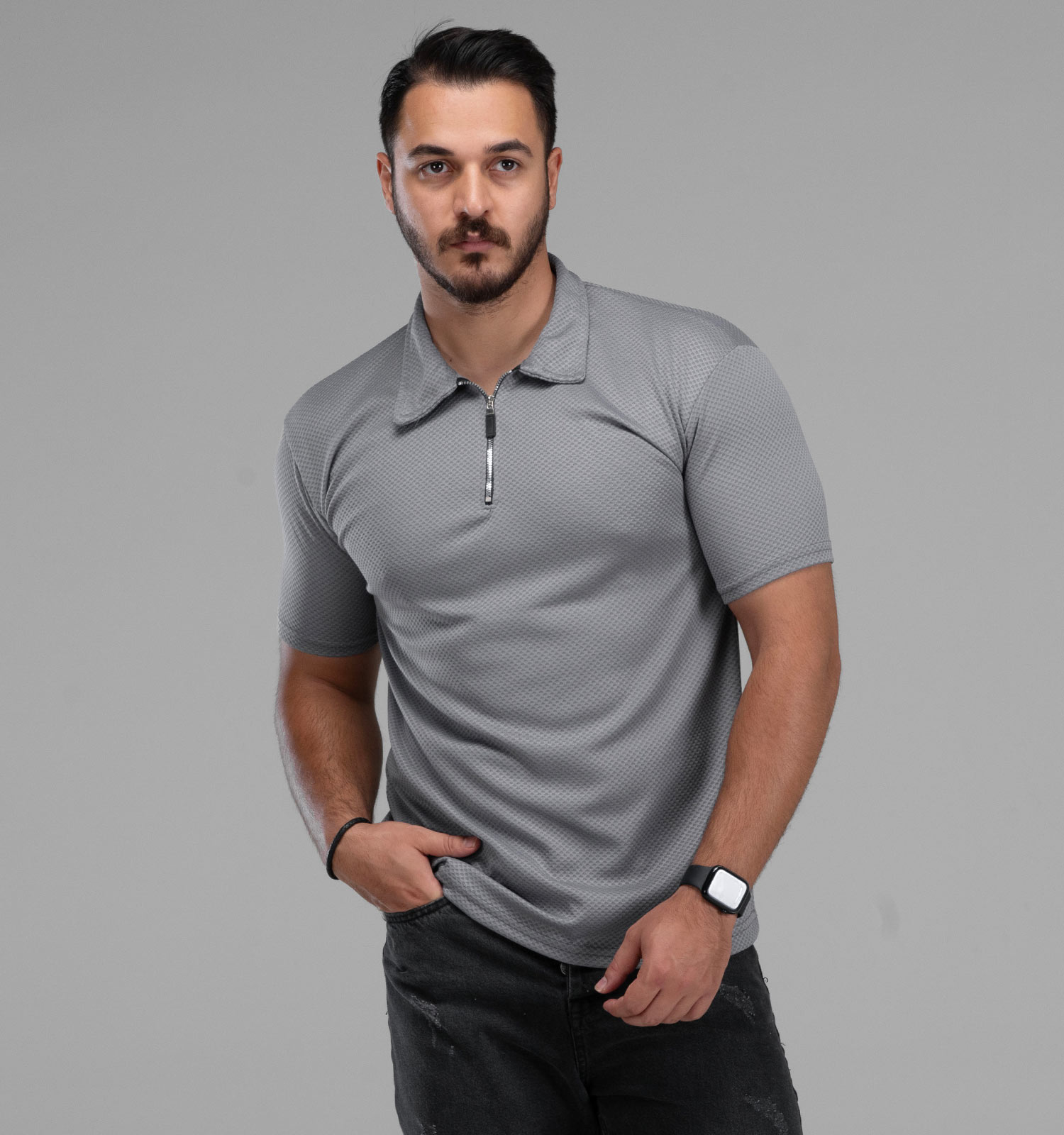 تیشرت یقه دار نیم زیپ طوسی مردانه مدل بیسکویتی