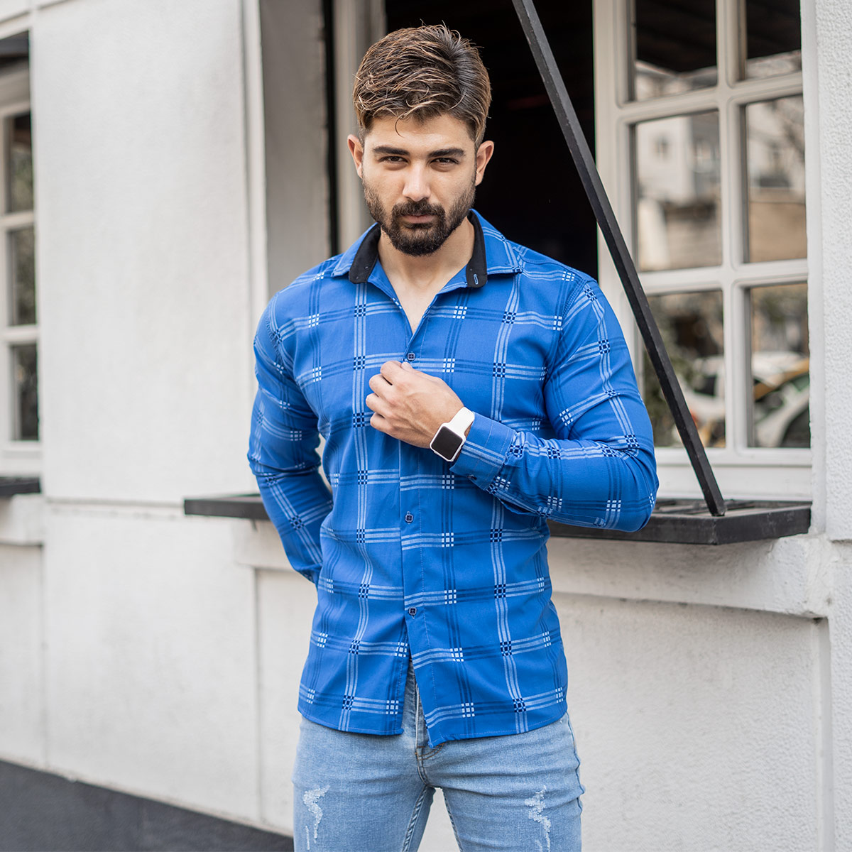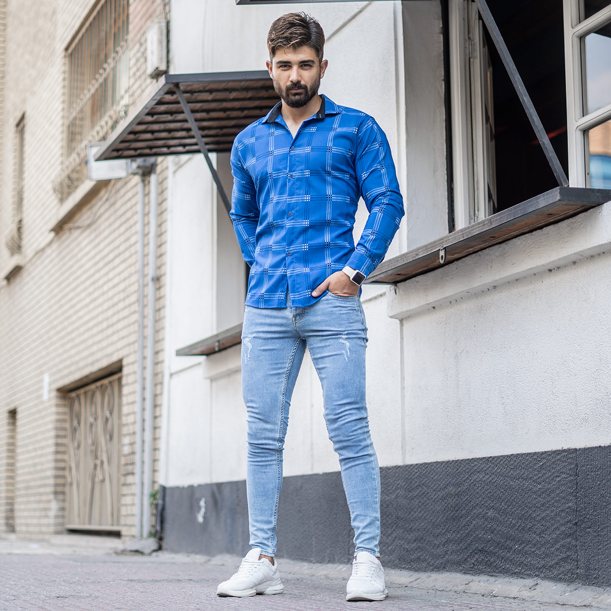 پیراهن چهار خونه آبی روشن مردانه آستین بلند طرح 2021 مدل Siyam