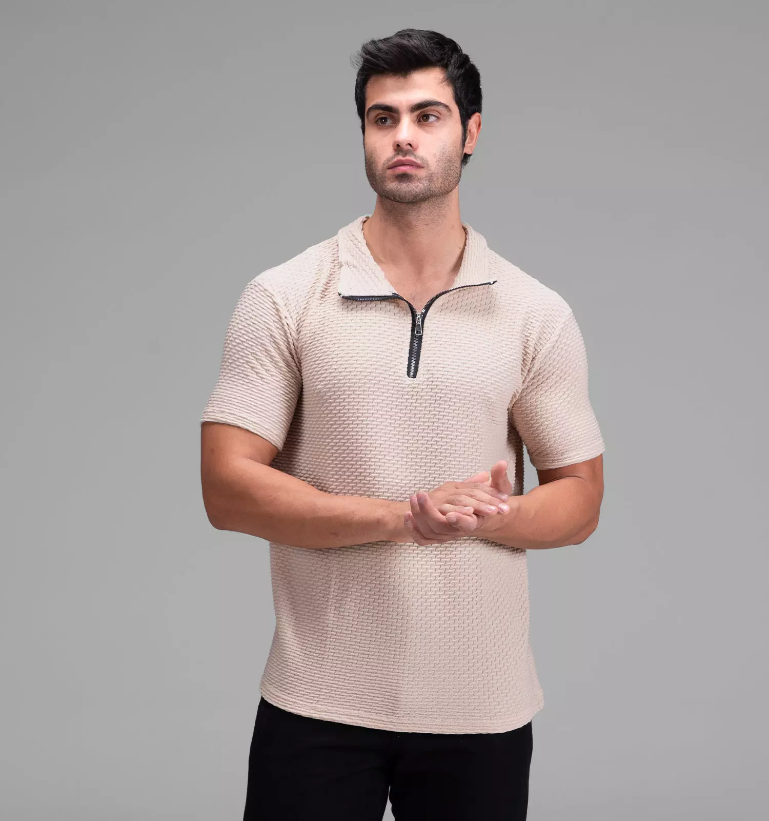 پولوشرت یقه زیپ دار که تک رنگ است و پارچه ای برجسته و باکیفیت دارد