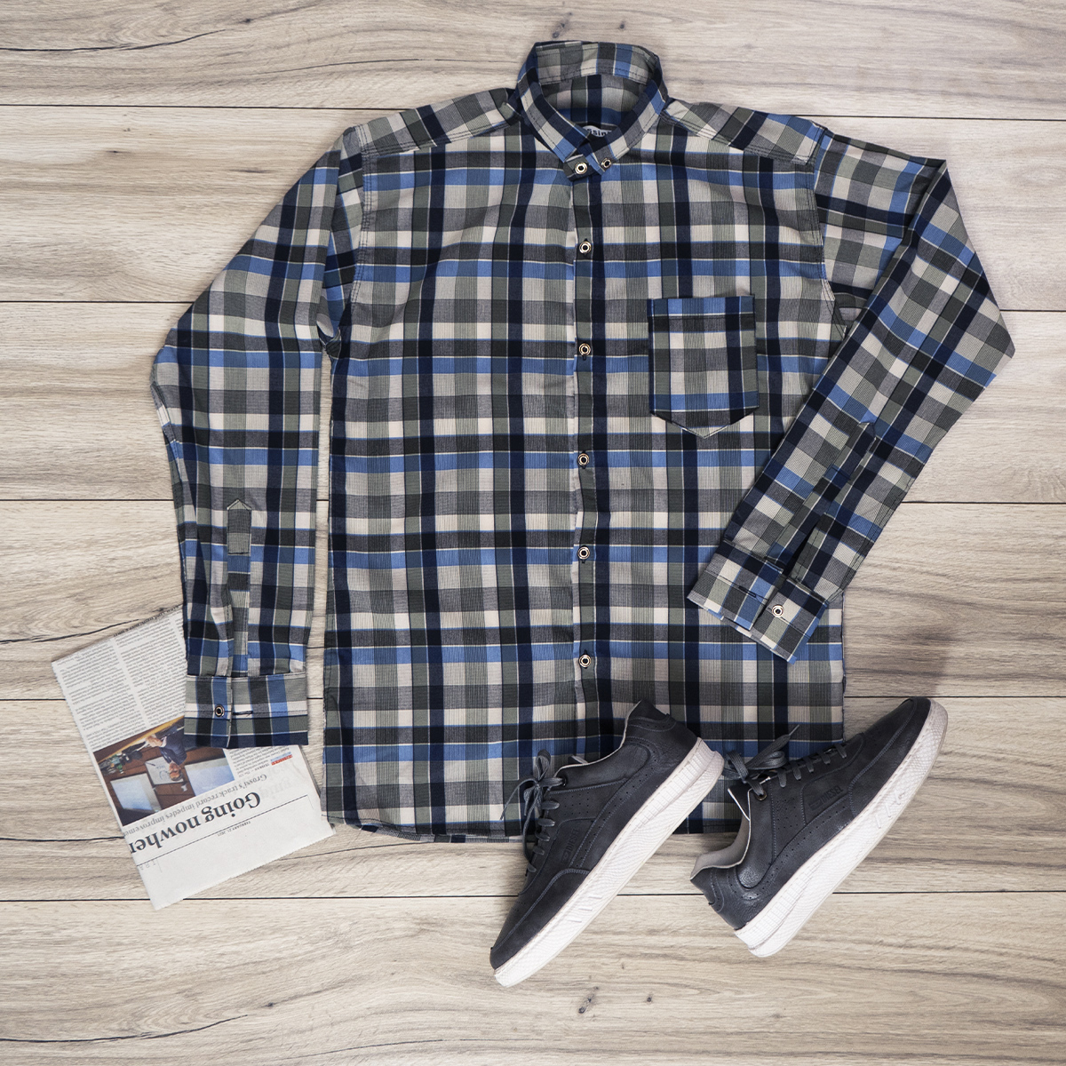 پیراهن چهارخانه مردانه (آستین بلند) آبی طوسی نخی جدید