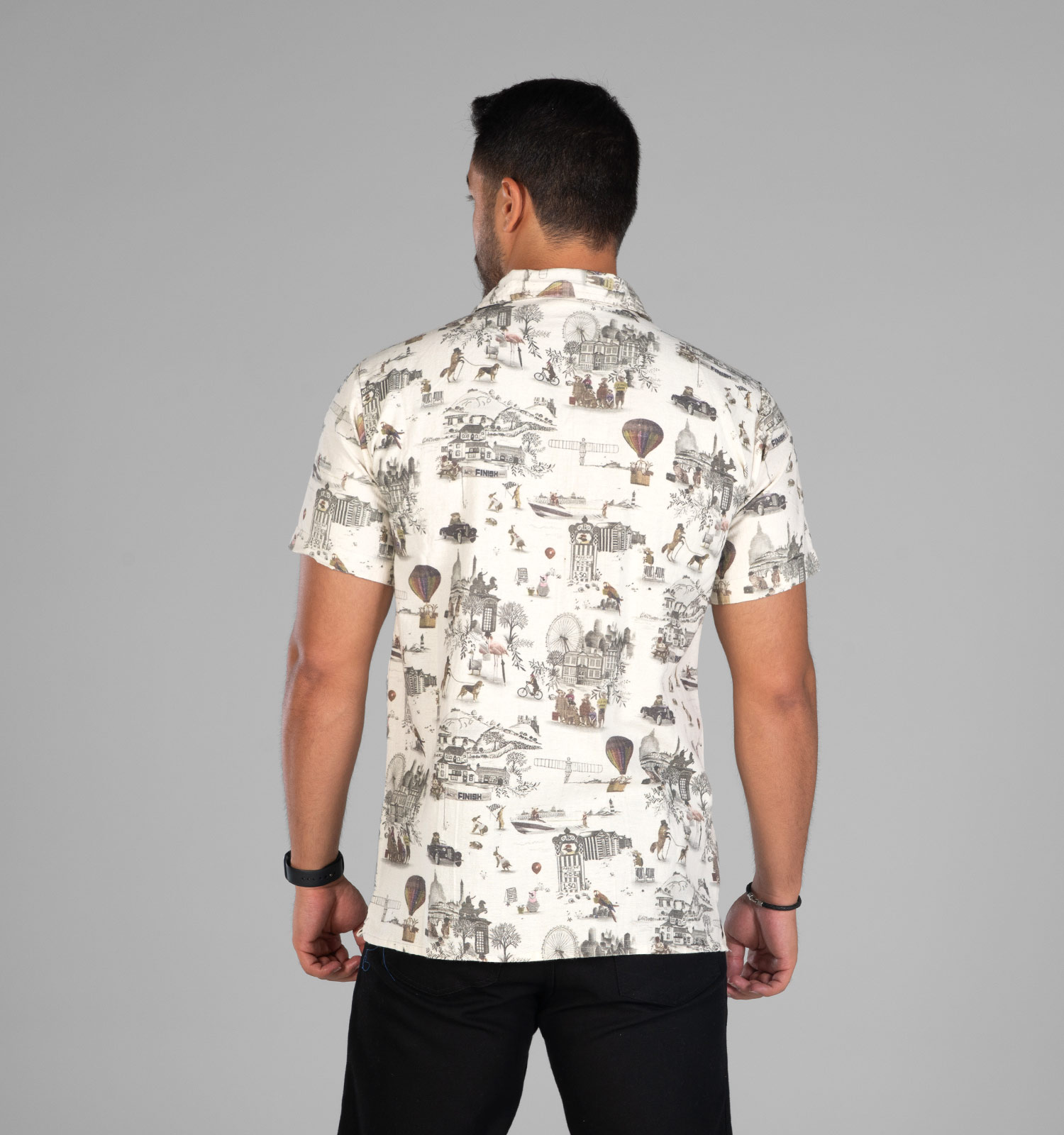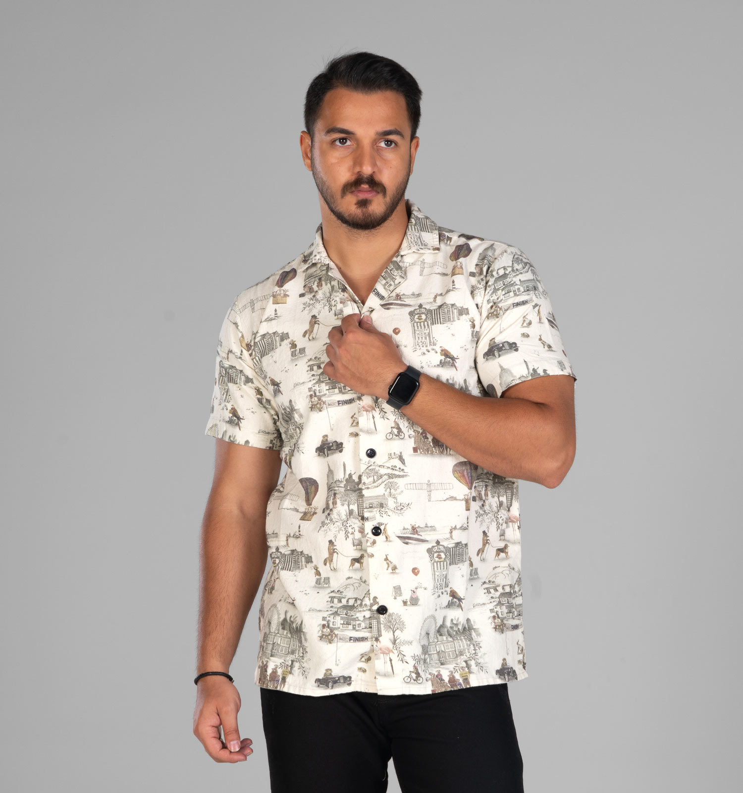 پیراهن لینن مردانه آستین کوتاه رنگ کرم طرحدار