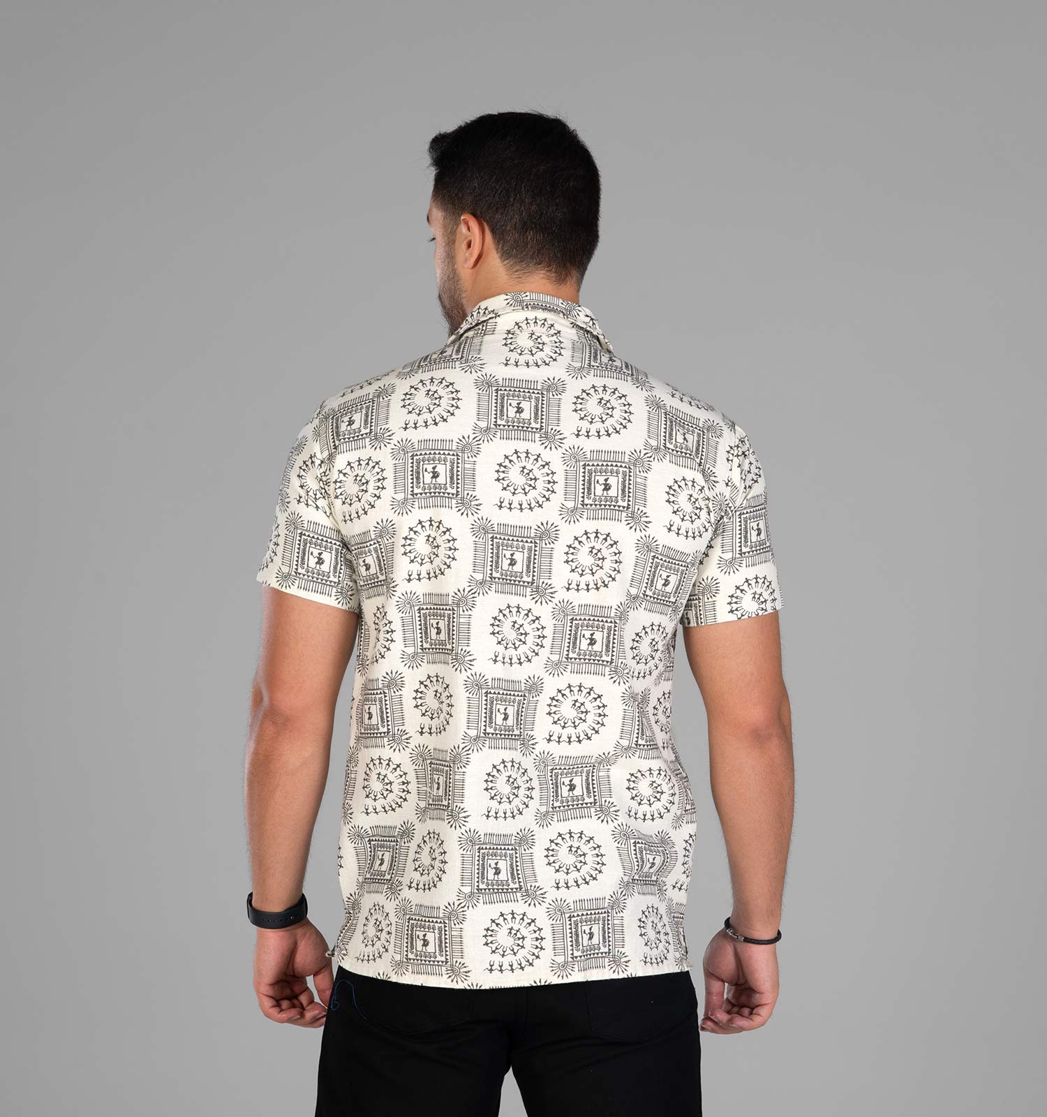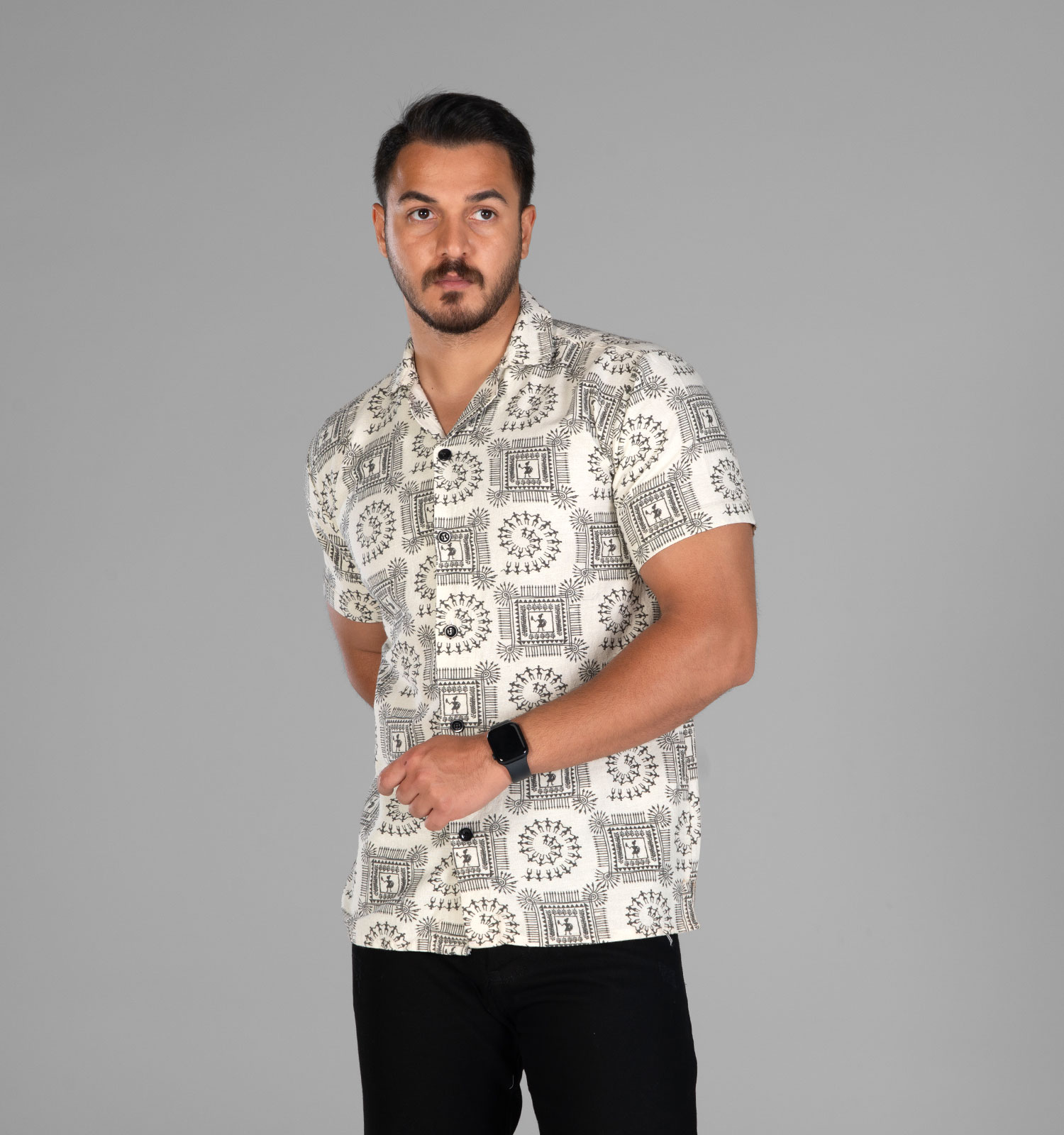 پیراهن آستین کوتاه کرم جنس لینن مردانه تمام طرح