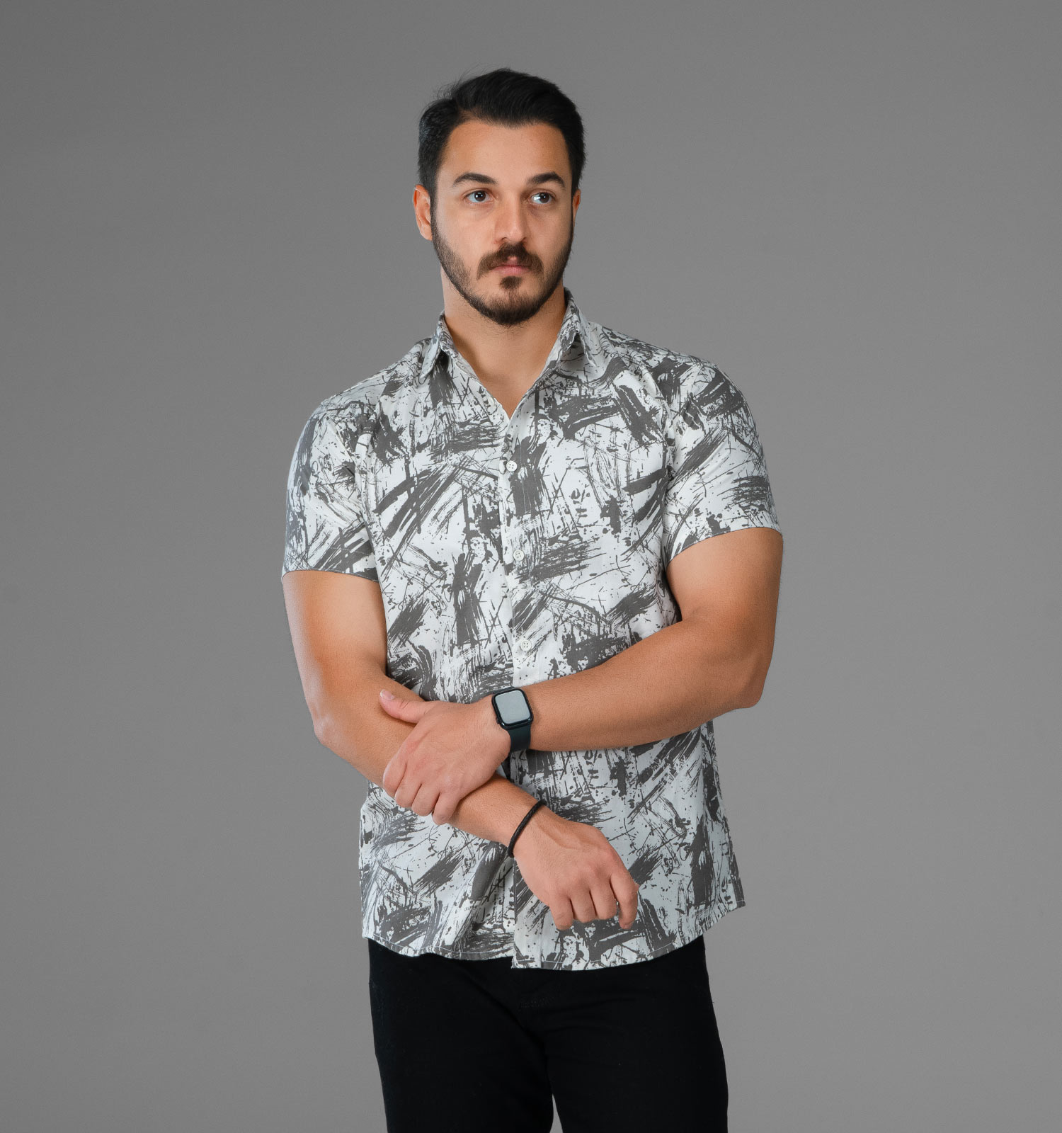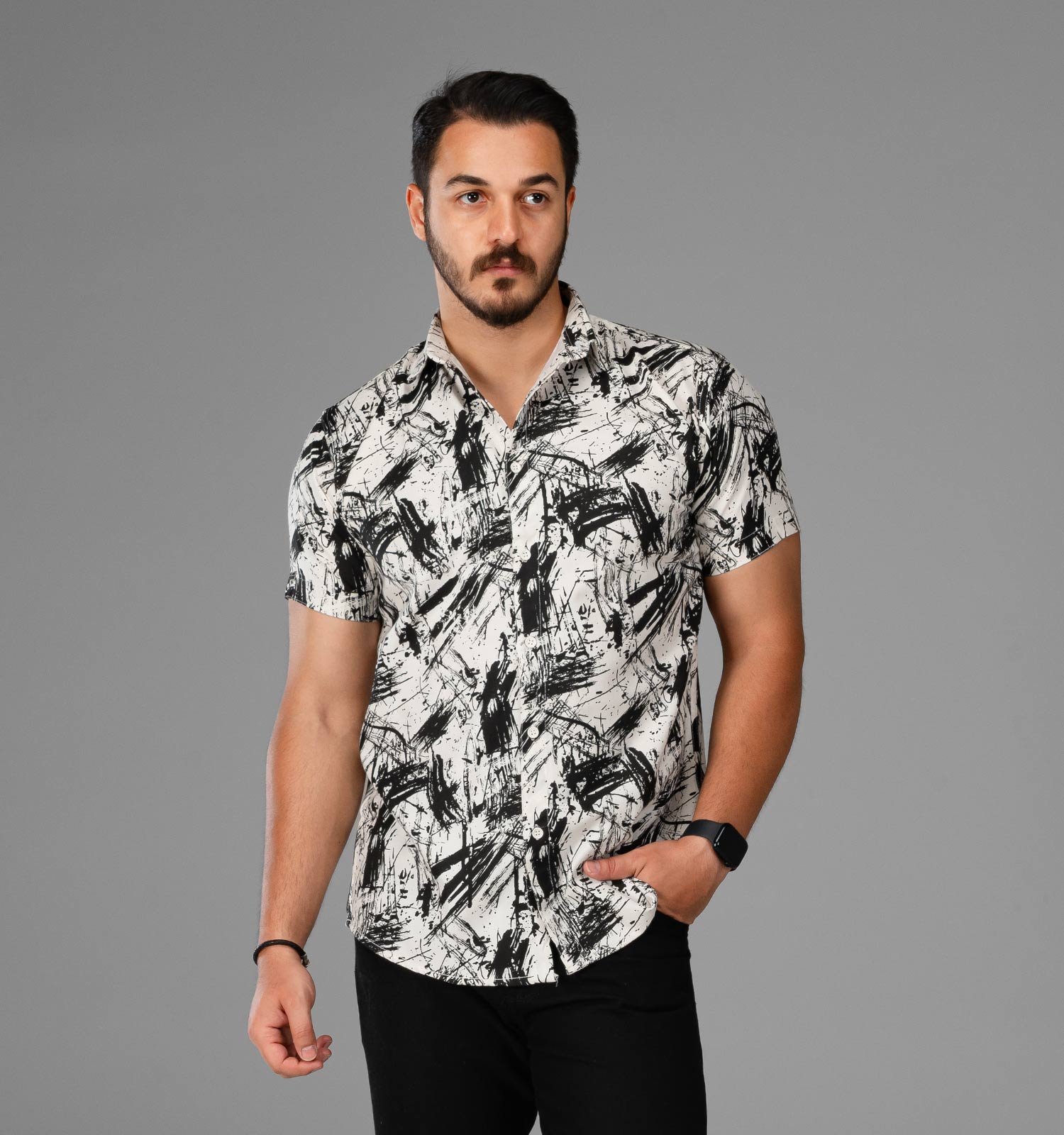 پیراهن آستین کوتاه مردانه رنگ سفید مشکی کنفی