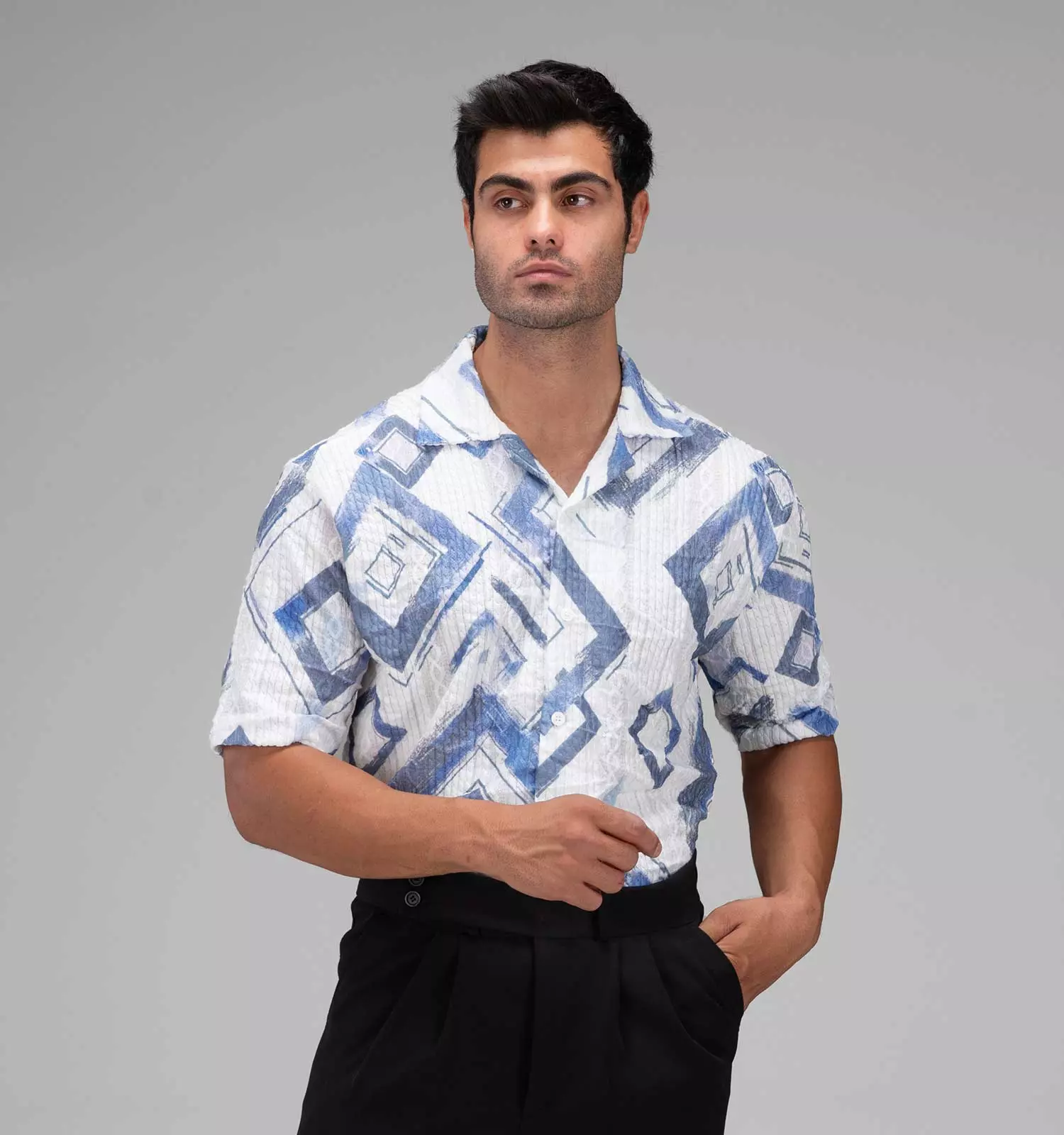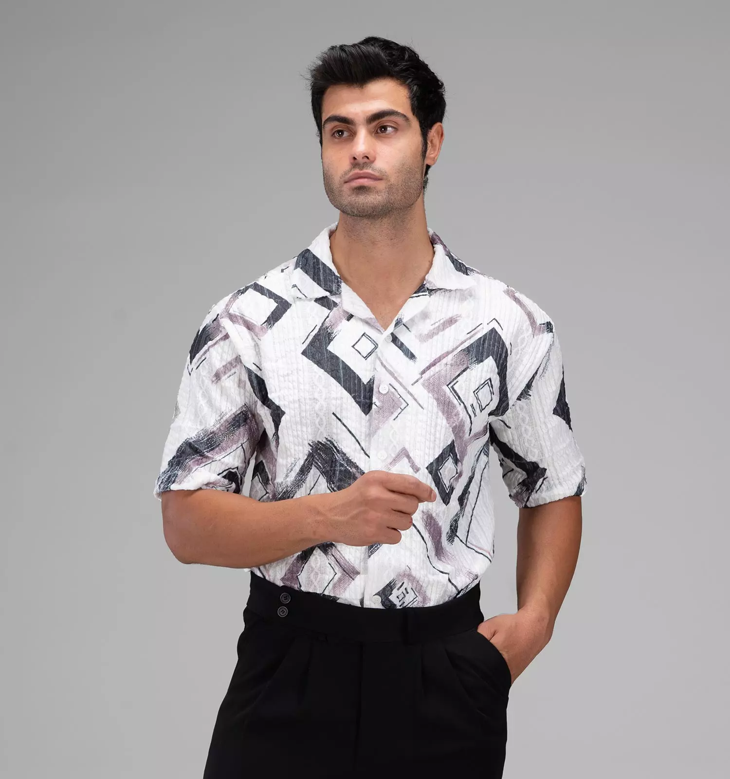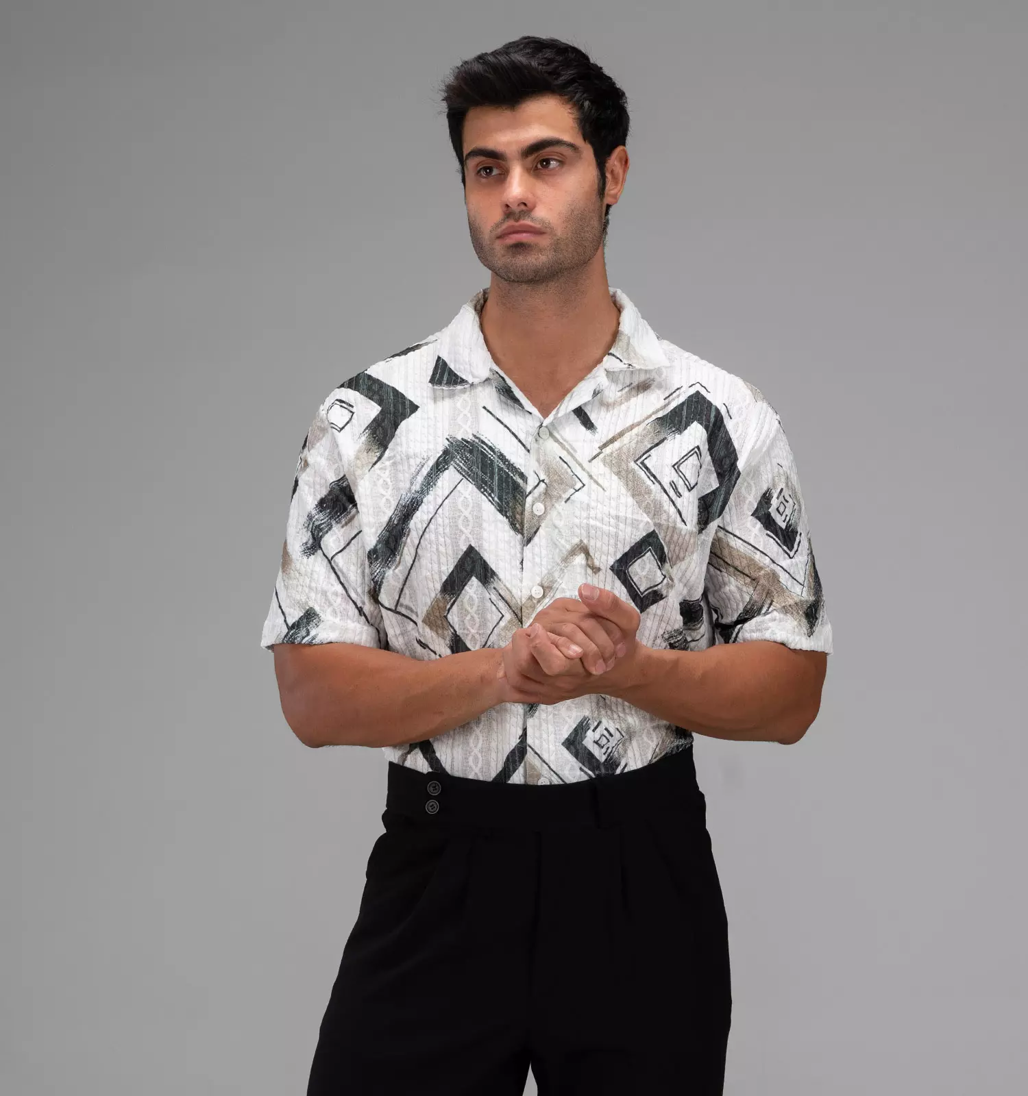 پیراهن آستین کوتاه طرحدار لوز لوزی مردانه زمینه سفید