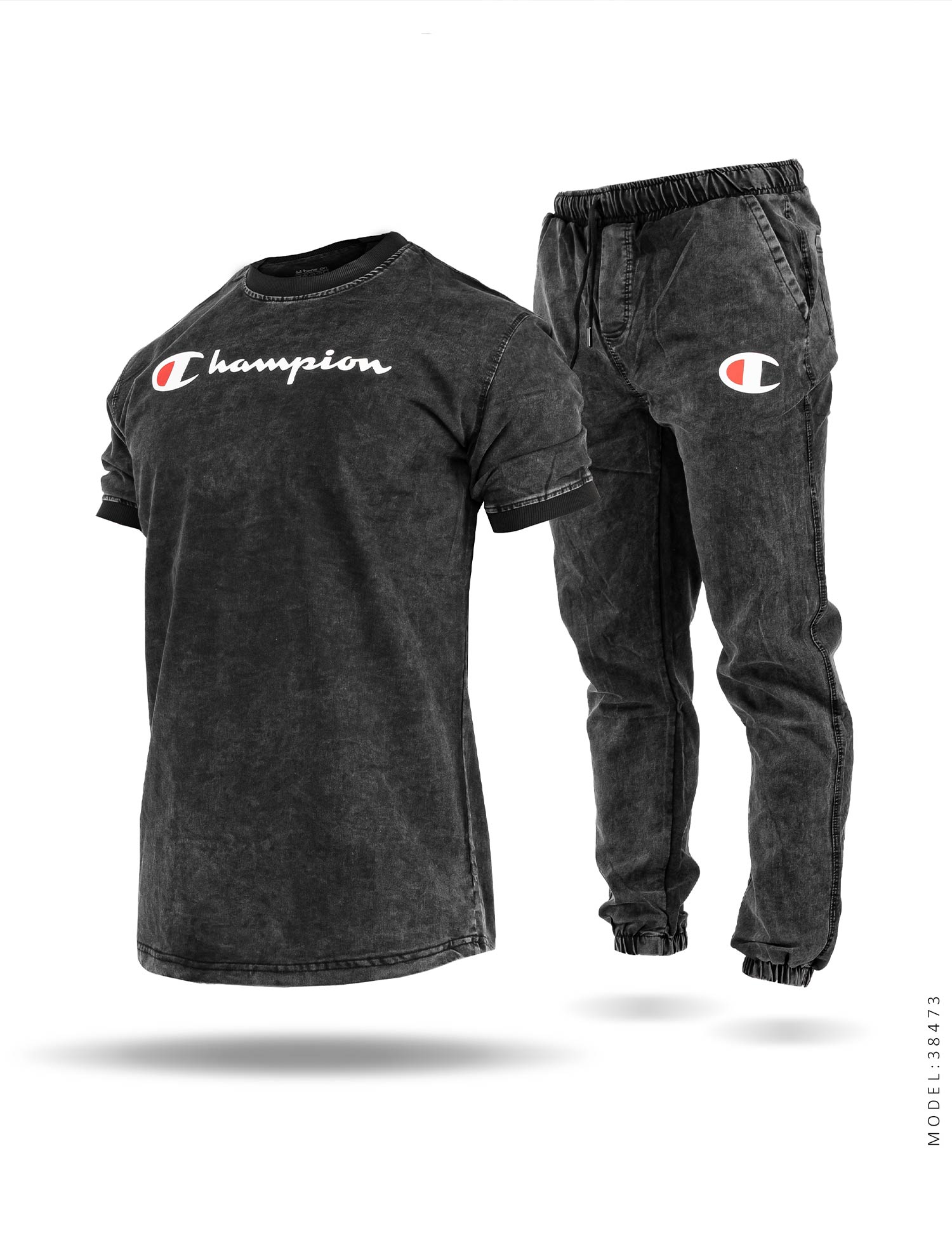 ست تیشرت شلوار اسلش مردانه جین سنگ شور ذغالی
