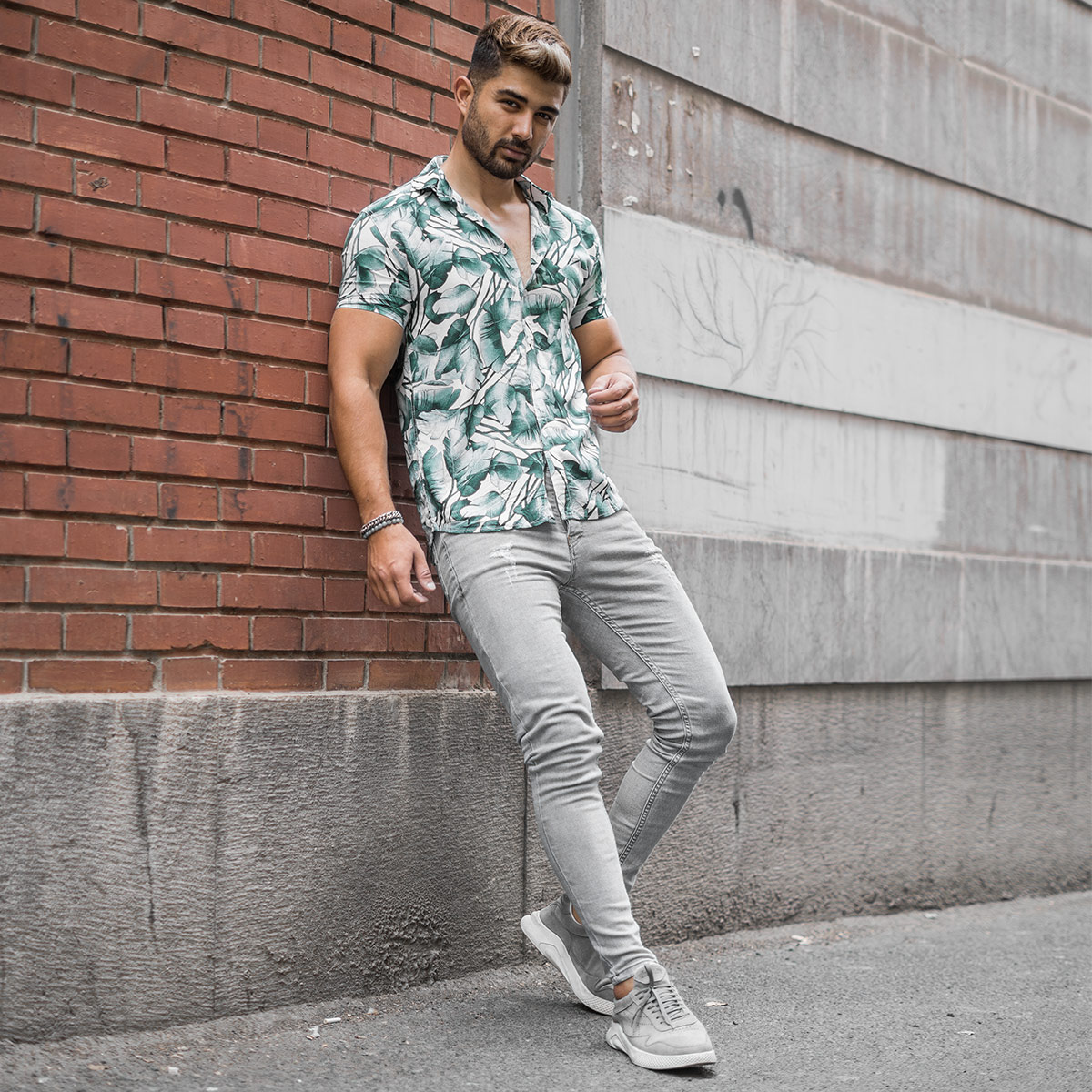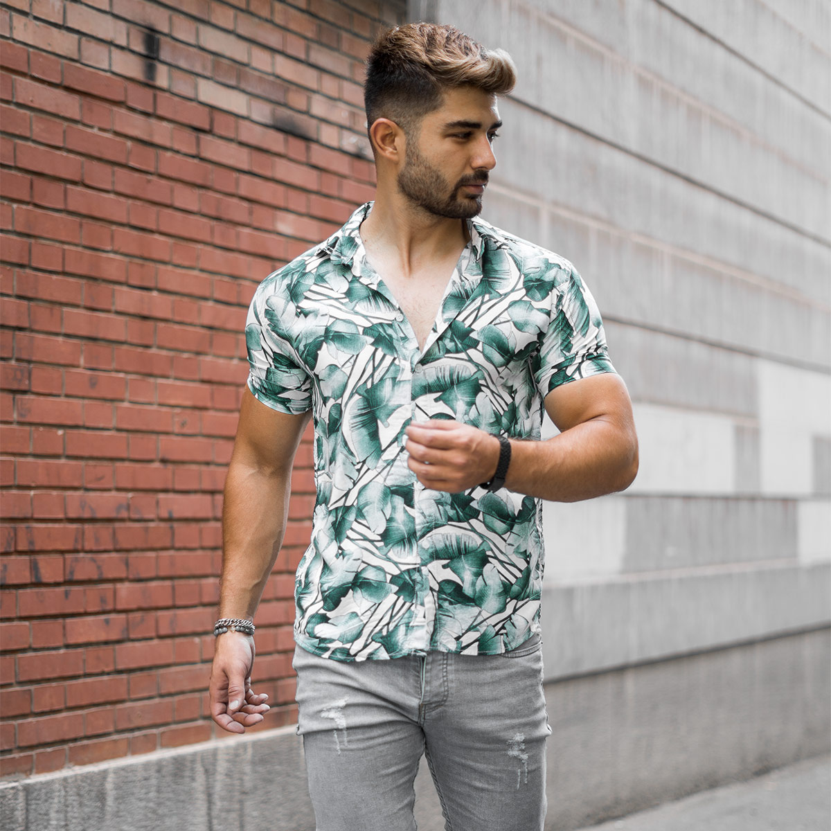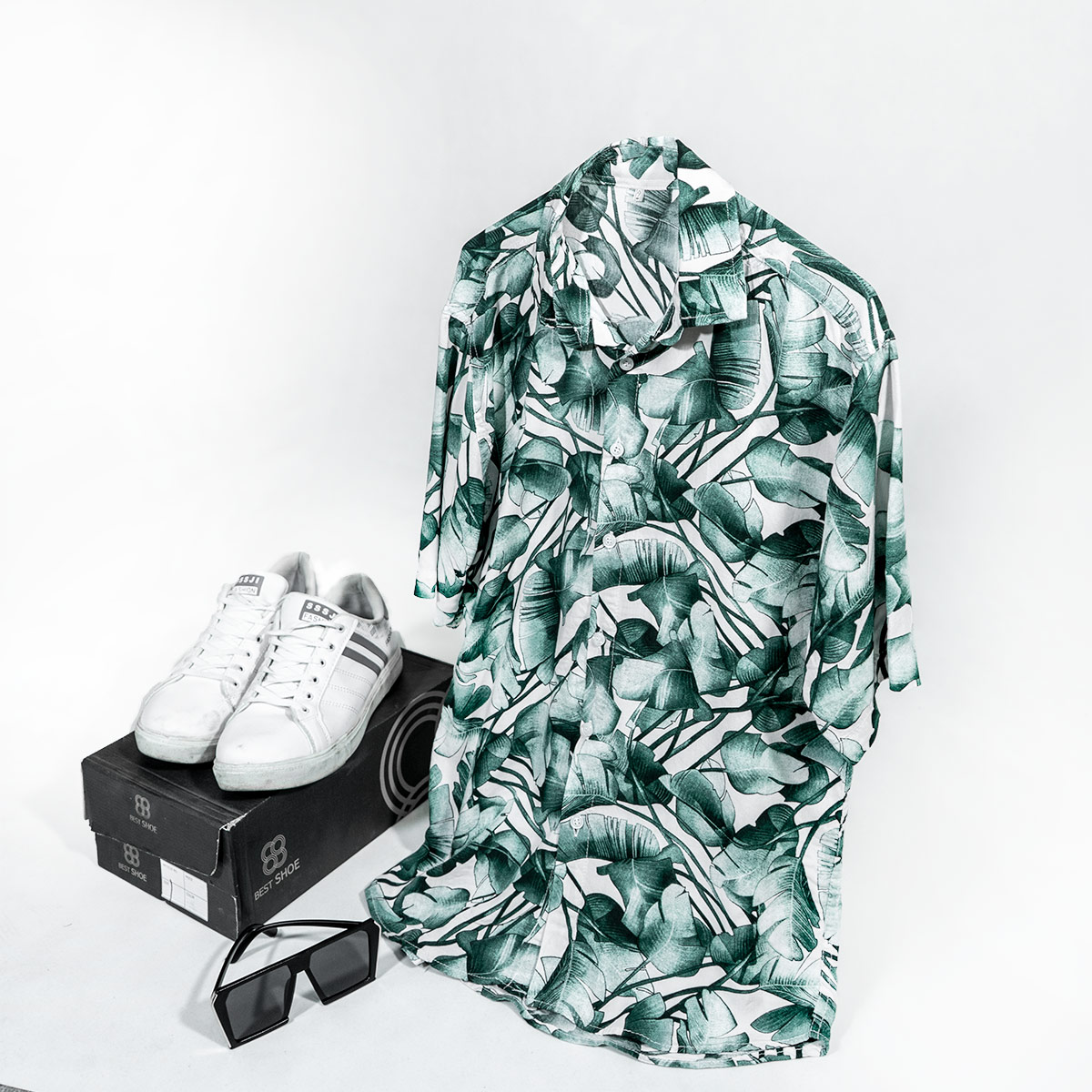 پیراهن هاوایی سفید مردانه طرحدار سبز آستین کوتاه جدید