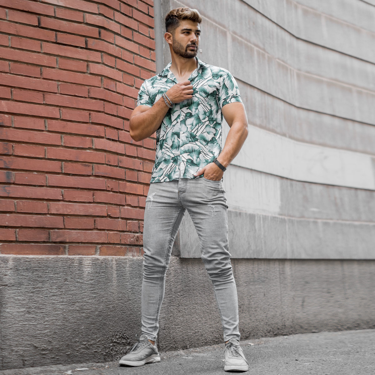 پیراهن هاوایی مردانه زمینه سفید و طرح برگ سبز مدل Bilo جدید