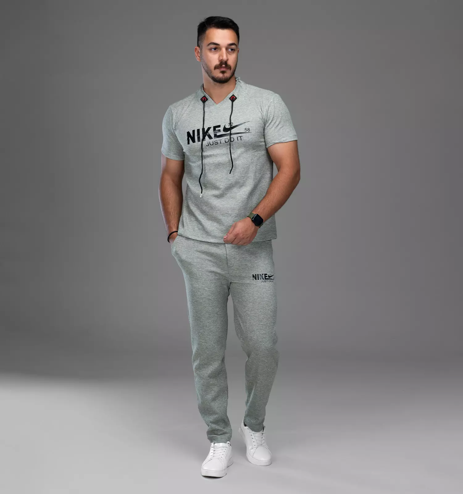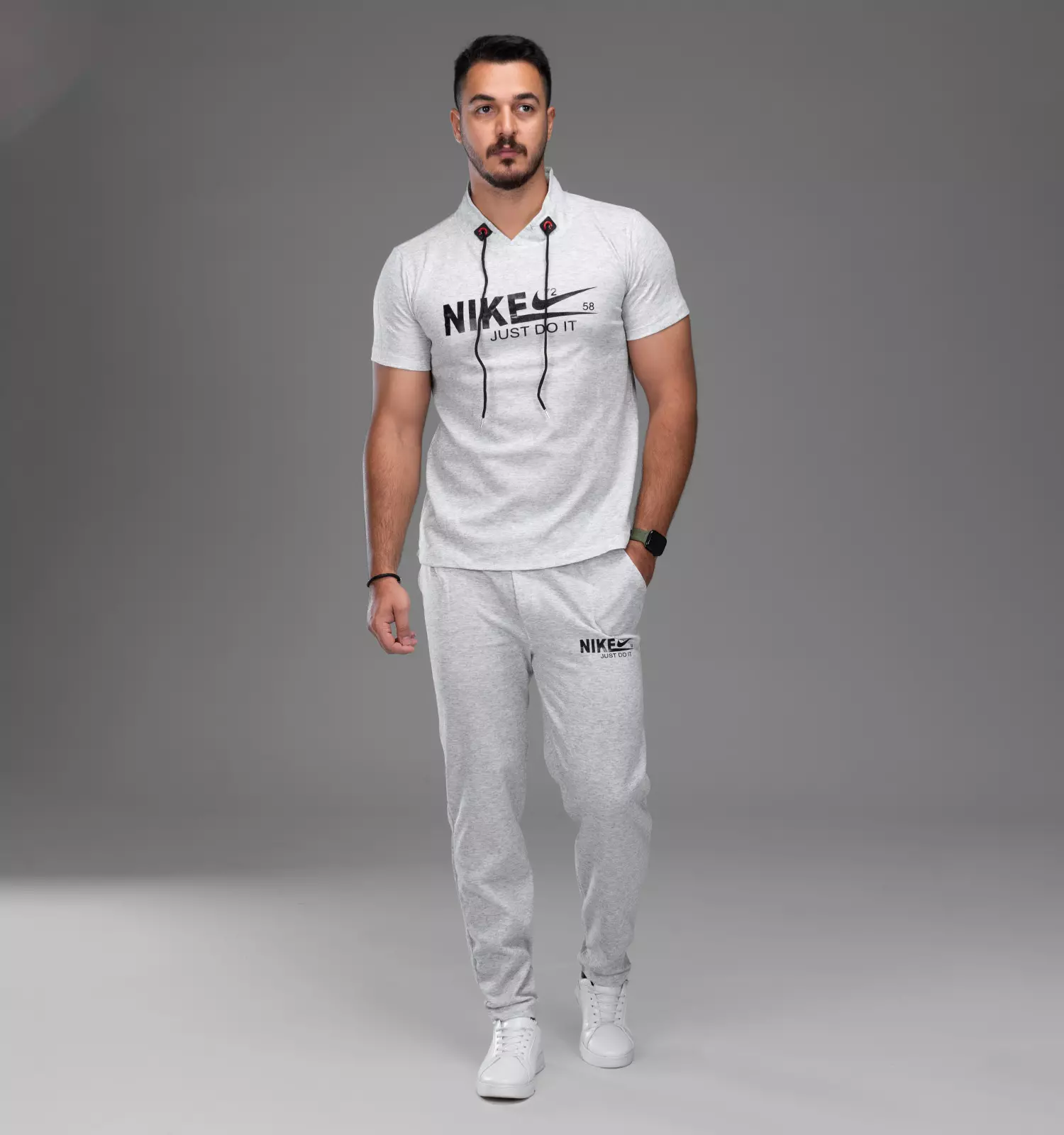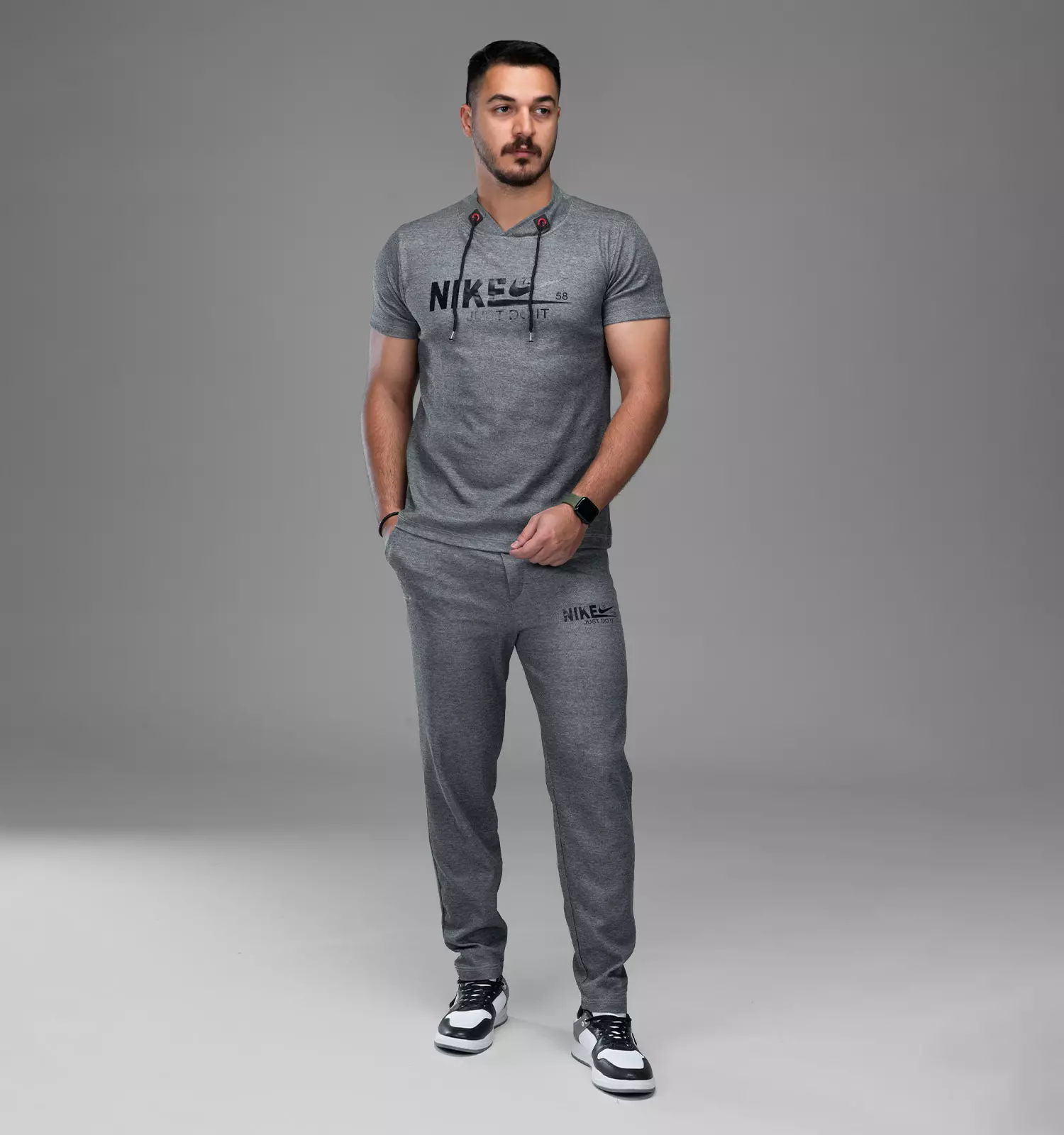 ست تیشرت و شلوار مردانه از رنگ طوسی و طرح Nike برخوردار است.