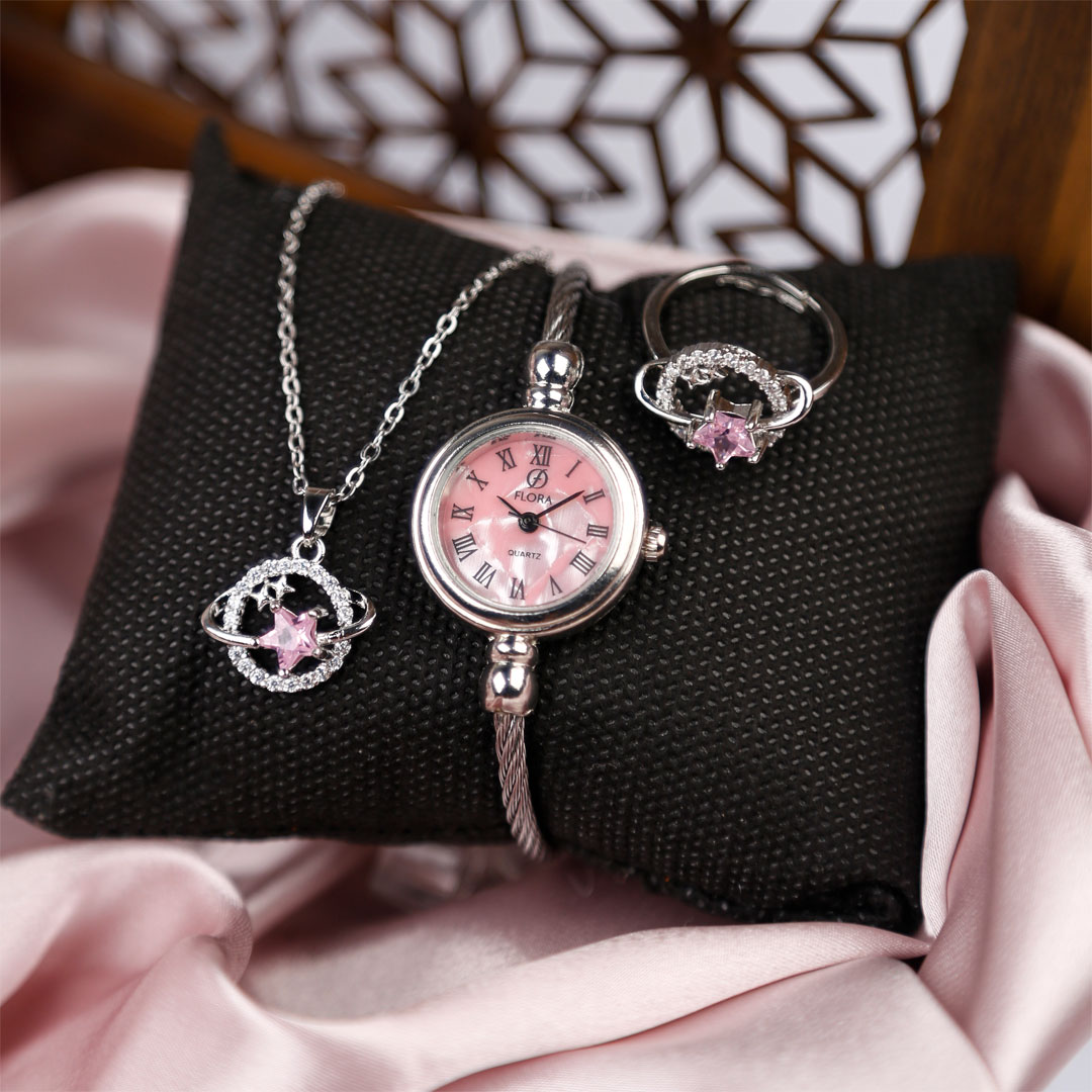 ست ساعت انگشتر گردنبند استیل زنانه نگین ستاره ای
